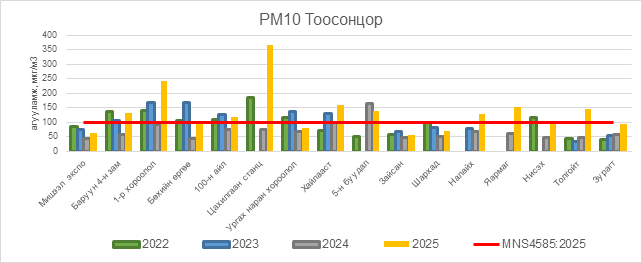РМ10 тоосонцор нь Баруун 4-н зам орчим АЧС-аас 32 мкг/м3 –ээр их, 1-р хороолол орчим АЧС-аас 141 мкг/м3 –ээр их, Бөхийн өргөө орчим АЧС-аас 6 мкг/м3 –ээр их, 100-н айл орчим АЧС-аас 19 мкг/м3 –ээр их, Цахилгаан станц орчим АЧС-аас 267 мкг/м3 –ээр их, Хайлааст орчим АЧС-аас 161 мкг/м3 –ээр их, 5-н буудал орчим АЧС-аас 38 мкг/м3 –ээр их, Налайх орчим АЧС-аас 30 мкг/м3 –ээр их, Яармаг орчим АЧС-аас 52 мкг/м3 –ээр их, Толгойт орчим АЧС-аас 45 мкг/м3 –ээр их, бусад цэгүүдэд MNS 4585:2025 АЧС-аас даваагүй байна.