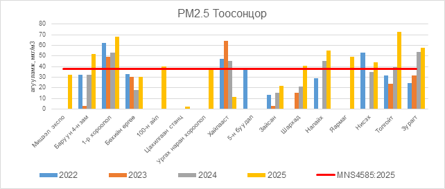 РМ2.5 тоосонцор нь Баруун 4-н зам орчим АЧС-аас 14.5 мкг/м3 –ээр их, 1-р хороолол орчим АЧС-аас 30.5 мкг/м3 –ээр их, 100-н айл орчим АЧС-аас 2.5 мкг/м3 –ээр их, Шархад орчим АЧС-аас 3.5 мкг/м3 –ээр их, Налайх орчим АЧС-аас 17.5 мкг/м3 –ээр их, Яармаг орчим АЧС-аас 11.5 мкг/м3 –ээр их, Нисэх орчим АЧС-аас 6.5 мкг/м3 –ээр их, Толгойт орчим АЧС-аас 35.5 мкг/м3 –ээр их, Зурагт орчим АЧС-аас 20.5 мкг/м3 –ээр их, бусад цэгүүдэд MNS 4585:2025 АЧС-аас даваагүй байна.