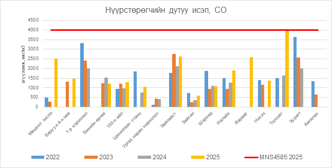 2025 оны 10 дугаар сарын 22-ны байдлаар нүүрстөрөгчийн дутуу исэл (СО) нь бүх цэгүүдэд MNS 4585:2025 АЧС-аас даваагүй байна.