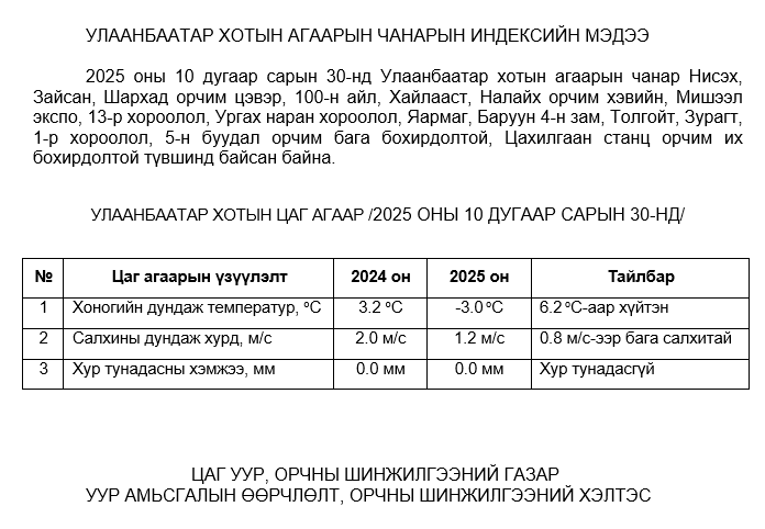 2025 оны 10 дугаар сарын 30-ны байдлаар хүхэрлэг хий (SO2) нь Мишээл экспо орчим АЧС-аас 1 мкг/м3 –ээр их, бусад цэгүүдэд MNS 4585:2025 АЧС-аас даваагүй байна.