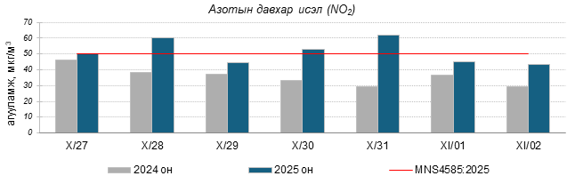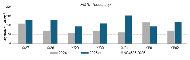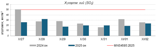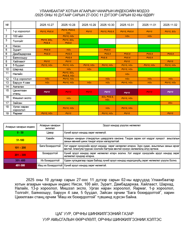 Улаанбаатар хотын агаарт түгээмэл бохирдуулах бодис хүхэрлэг хий /SO2/, азотын давхар исэл /NO2/, тоосонцор /PM10, PM2.5/, нүүрстөрөгчийн дутуу исэл /CO/, озон /O3/-ны агууламжийг тодорхойллоо.