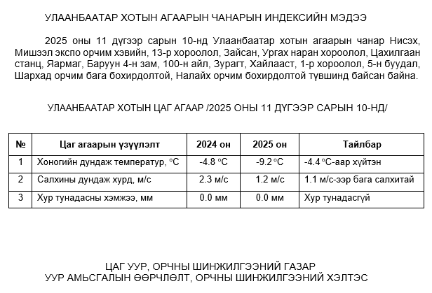 УЛААНБААТАР ХОТЫН АГААРЫН ЧАНАРЫН ХЯНАЛТ ШИНЖИЛГЭЭНИЙ ХОНОГИЙН МЭДЭЭ /2025.11.10/