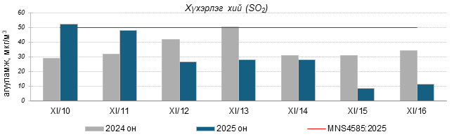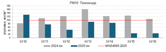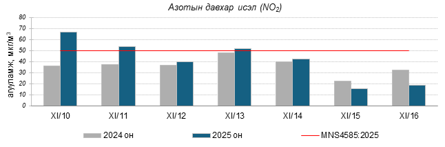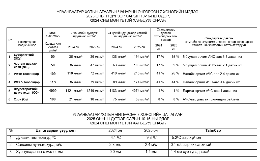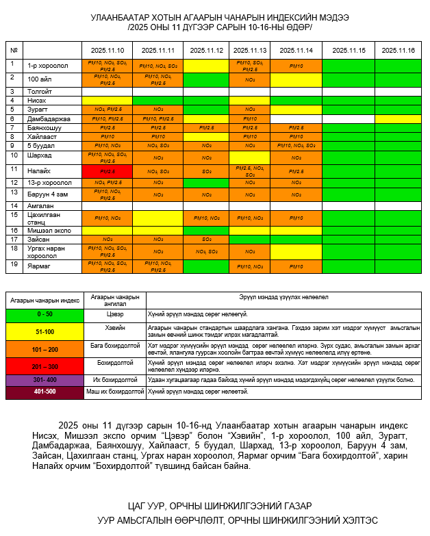 Улаанбаатар хотын агаарт түгээмэл бохирдуулах бодис хүхэрлэг хий /SO2/, азотын давхар исэл /NO2/, тоосонцор /PM10, PM2.5/, нүүрстөрөгчийн дутуу исэл /CO/, озон /O3/-ны агууламжийг тодорхойллоо.