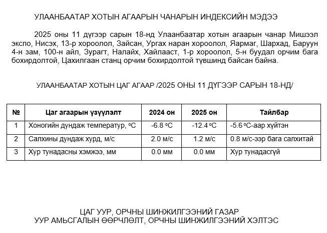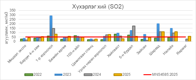 2025 оны 11 дүгээр сарын 18-ны байдлаар хүхэрлэг хий (SO2) нь Баруун 4-н зам орчим АЧС-аас 3 мкг/м3 –ээр их, 1-р хороолол орчим 32 мкг/м3 –ээр их, Бөхийн өргөө орчим АЧС-аас 9 мкг/м3 –ээр их, Ургах наран хороолол орчим АЧС-аас 28 мкг/м3 –ээр их, 5-н буудал орчим АЧС-аас 9 мкг/м3 –ээр их, Шархад орчим АЧС-аас 60 мкг/м3 –ээр их, Налайх орчим АЧС-аас 61 мкг/м3 –ээр их, Яармаг орчим АЧС-аас 9 мкг/м3 –ээр их, бусад цэгүүдэд MNS 4585:2025 АЧС-аас даваагүй байна.