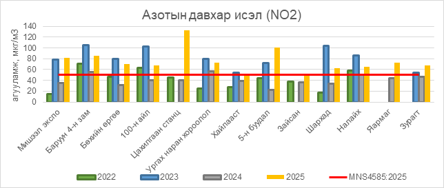 Азотын давхар исэл (NO2) нь Мишээл экспо орчим АЧС-аас 31 мкг/м3 –ээр их, Баруун 4-н зам орчим АЧС-аас 36 мкг/м3 –ээр их, Бөхийн өргөө орчим АЧС-аас 20 мкг/м3 –ээр их, 100-н айл орчим АЧС-аас 18 мкг/м3 –ээр их, Цахилгаан станц орчим АЧС-аас 82 мкг/м3 –ээр их, Ургах наран хороолол орчим АЧС-аас 23 мкг/м3 –ээр их, 5-н буудал орчим АЧС-аас 51 мкг/м3 –ээр их, Зайсан орчим АЧС-аас 3 мкг/м3 –ээр их, Шархад орчим АЧС-аас 13 мкг/м3 –ээр их, Налайх орчим АЧС-аас 15 мкг/м3 –ээр их, Яармаг орчим АЧС-аас 23 мкг/м3 –ээр их, Зурагт орчим АЧС-аас 17 мкг/м3 –ээр их байна.