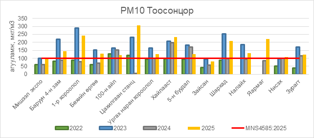 РМ10 тоосонцор нь Баруун 4-н зам орчим АЧС-аас 43 мкг/м3 –ээр их, 1-р хороолол орчим АЧС-аас 142 мкг/м3 –ээр их, Бөхийн өргөө орчим АЧС-аас 30 мкг/м3 –ээр их, 100-н айл орчим АЧС-аас 20 мкг/м3 –ээр их, Цахилгаан станц орчим АЧС-аас 205 мкг/м3 –ээр их, Ургах наран хороолол орчим АЧС-аас 25 мкг/м3 –ээр их, Хайлааст орчим АЧС-аас 133 мкг/м3 –ээр их, 5-н буудал орчим АЧС-аас 25 мкг/м3 –ээр их, Шархад орчим АЧС-аас 108 мкг/м3 –ээр их, Налайх орчим АЧС-аас 31 мкг/м3 –ээр их, Яармаг орчим АЧС-аас 122 мкг/м3 –ээр их, Нисэх орчим АЧС-аас 9 мкг/м3 –ээр их, Зурагт орчим АЧС-аас 23 мкг/м3 –ээр их байна.