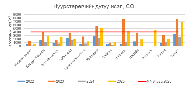Нүүрстөрөгчийн дутуу исэл (СО) нь Хайлааст орчим АЧС-аас 1097 мкг/м3 –ээр их, Шархад орчим АЧС-аас 271 мкг/м3 –ээр их, Яармаг орчим АЧС-аас 500 мкг/м3 –ээр их, Зурагт орчим АЧС-аас 2846 мкг/м3 –ээр их, бусад цэгүүдэд MNS 4585:2025 АЧС-аас даваагүй байна.
