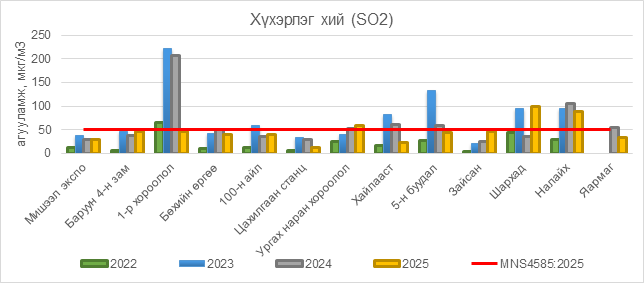 2025 оны 11 дүгээр сарын 19-ний байдлаар хүхэрлэг хий (SO2) нь Ургах наран хороолол орчим АЧС-аас 10 мкг/м3 –ээр их, Шархад орчим АЧС-аас 50 мкг/м3 –ээр их, Налайх орчим АЧС-аас 38 мкг/м3 –ээр их, бусад цэгүүдэд MNS 4585:2025 АЧС-аас даваагүй байна.