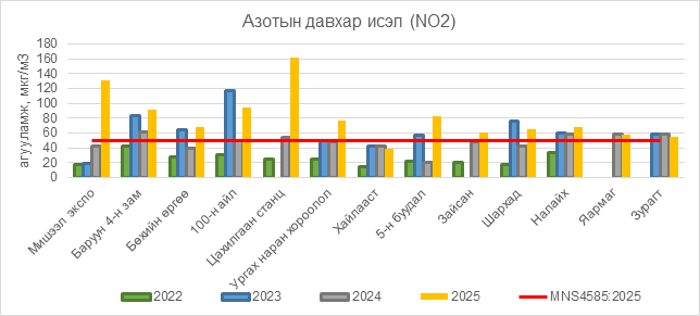Азотын давхар исэл (NO2) нь Мишээл экспо орчим АЧС-аас 81 мкг/м3 –ээр их, Баруун 4-н зам орчим АЧС-аас 41 мкг/м3 –ээр их, Бөхийн өргөө орчим АЧС-аас 18 мкг/м3 –ээр их, 100-н айл орчим АЧС-аас 44 мкг/м3 –ээр их, Цахилгаан станц орчим АЧС-аас 112 мкг/м3 –ээр их, Ургах наран хороолол орчим АЧС-аас 26 мкг/м3 –ээр их,  5-н буудал орчим АЧС-аас 33 мкг/м3 –ээр их, Зайсан орчим АЧС-аас 10 мкг/м3 –ээр их, Шархад орчим АЧС-аас 15 мкг/м3 –ээр их, Налайх орчим АЧС-аас 18 мкг/м3 –ээр их, Яармаг орчим АЧС-аас 8 мкг/м3 –ээр их, Зурагт орчим АЧС-аас 4 мкг/м3 –ээр их байна. бусад цэгүүдэд MNS 4585:2025 АЧС-аас даваагүй байна.