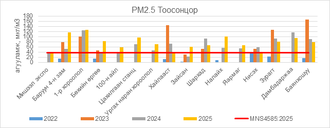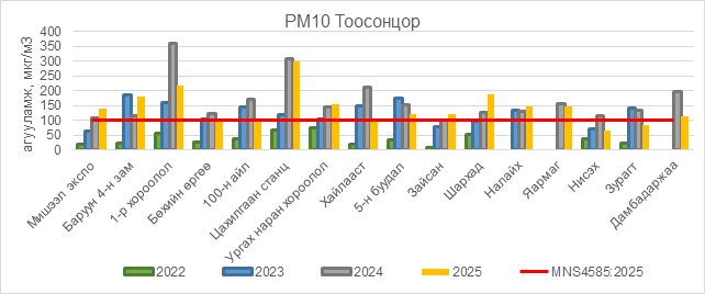РМ10 тоосонцор нь Мишээл экспо орчим АЧС-аас 41 мкг/м3 –ээр их, Баруун 4-н зам орчим АЧС-аас 83 мкг/м3 –ээр их, 1-р хороолол орчим АЧС-аас 120 мкг/м3 –ээр их, Бөхийн өргөө орчим АЧС-аас 4 мкг/м3 –ээр их, Цахилгаан станц орчим АЧС-аас 199 мкг/м3 –ээр их, Ургах наран хороолол орчим АЧС-аас 55 мкг/м3 –ээр их, 5-н буудал орчим АЧС-аас 23 мкг/м3 –ээр их, Зайсан орчим АЧС-аас 21 мкг/м3 –ээр их, Шархад орчим АЧС-аас 88 мкг/м3 –ээр их, Налайх орчим АЧС-аас 47 мкг/м3 –ээр их, Яармаг орчим АЧС-аас 49 мкг/м3 –ээр их, Дамбадаржаа орчим АЧС-аас 13 мкг/м3 –ээр их, бусад цэгүүдэд MNS 4585:2025 АЧС-аас даваагүй байна.