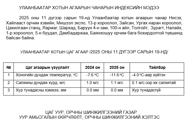 УЛААНБААТАР ХОТЫН АГААРЫН ЧАНАРЫН ХЯНАЛТ ШИНЖИЛГЭЭНИЙ ХОНОГИЙН МЭДЭЭ /2025.11.19/