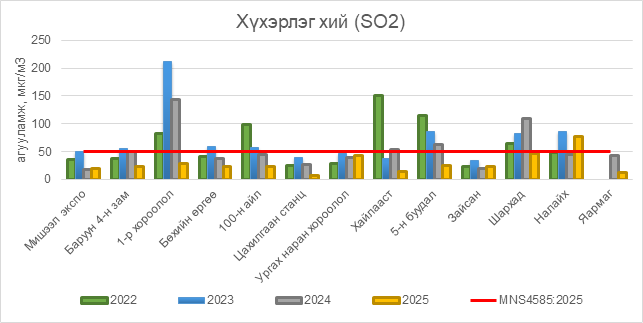 2025 оны 11 дүгээр сарын 23-ны байдлаар хүхэрлэг хий (SO2) нь Налайх орчим АЧС-аас 28 мкг/м3 –ээр их, бусад цэгүүдэд MNS 4585:2025 АЧС-аас даваагүй байна.