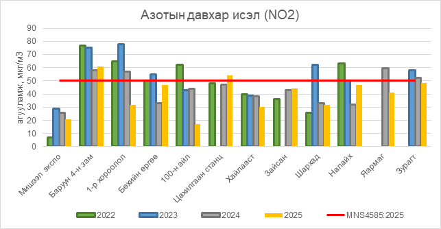 Азотын давхар исэл (NO2) нь Баруун 4-н зам орчим АЧС-аас 11 мкг/м3 –ээр их, Цахилгаан станц орчим АЧС-аас 4 мкг/м3 –ээр их, бусад цэгүүдэд MNS 4585:2025 АЧС-аас даваагүй байна.