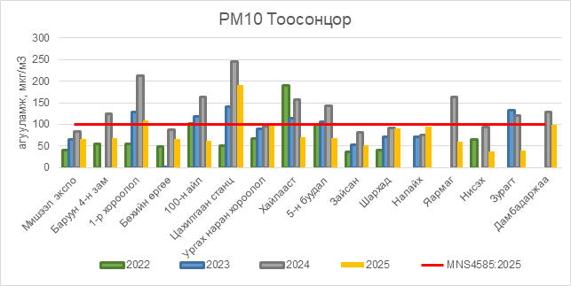 РМ10 тоосонцор нь 1-р хороолол орчим АЧС-аас 10 мкг/м3 –ээр их, Цахилгаан станц орчим АЧС-аас 91 мкг/м3 –ээр их, Ургах наран хороолол орчим АЧС-аас 3 мкг/м3 –ээр их, бусад цэгүүдэд MNS 4585:2025 АЧС-аас даваагүй байна.
