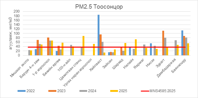 РМ2.5 тоосонцор нь Баруун 4-н зам орчим АЧС-аас 11.5 мкг/м3 –ээр их, 1-р хороолол орчим АЧС-аас 30.5 мкг/м3 –ээр их, Бөхийн өргөө орчим АЧС-аас 19.5 мкг/м3 –ээр их, 100-н айл орчим АЧС-аас 3.5 мкг/м3 –ээр их, Цахилгаан станц орчим АЧС-аас 51.5 мкг/м3 –ээр их, Ургах наран хороолол орчим АЧС-аас 14.5 мкг/м3 –ээр их, Шархад орчим АЧС-аас 19.5 мкг/м3 –ээр их, Налайх орчим АЧС-аас 34.5 мкг/м3 –ээр их, Дамбадаржаа орчим АЧС-аас 9.5 мкг/м3 –ээр их, Баянхошуу орчим АЧС-аас 16.5 мкг/м3 –ээр их, бусад цэгүүдэд MNS 4585:2025 АЧС-аас даваагүй байна.