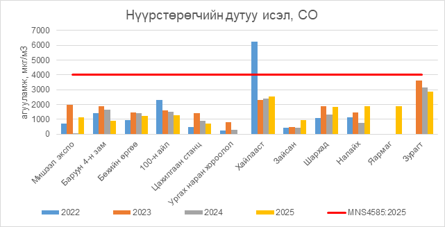 Нүүрстөрөгчийн дутуу исэл (СО) нь бүх цэгүүдэд MNS 4585:2025 АЧС-аас даваагүй байна.