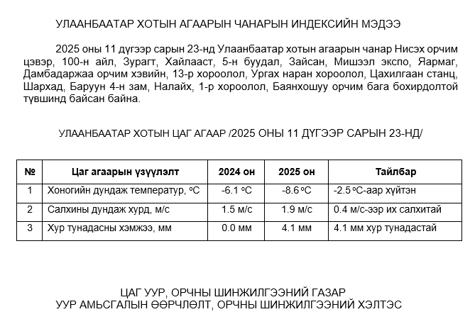 УЛААНБААТАР ХОТЫН АГААРЫН ЧАНАРЫН ХЯНАЛТ ШИНЖИЛГЭЭНИЙ ХОНОГИЙН МЭДЭЭ /2025.11.23/