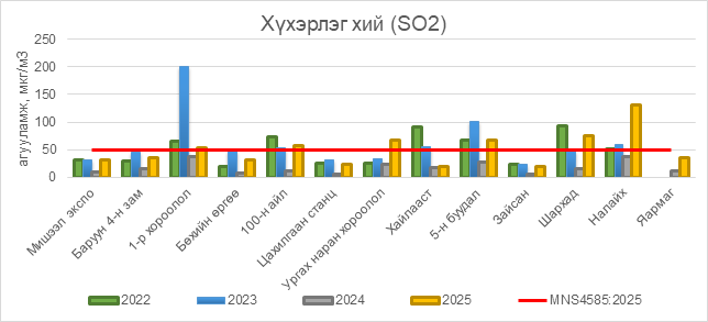 2025 оны 11 дүгээр сарын 24-ний байдлаар хүхэрлэг хий (SO2) нь 1-р хороолол орчим 4 мкг/м3 –ээр их, 100-н айл орчим АЧС-аас 7 мкг/м3 –ээр их, Ургах наран хороолол орчим АЧС-аас 17 мкг/м3 –ээр их, 5-н буудал орчим АЧС-аас 17 мкг/м3 –ээр их, Шархад орчим АЧС-аас 25 мкг/м3 –ээр их, Налайх орчим АЧС-аас 81 мкг/м3 –ээр их, бусад цэгүүдэд MNS 4585:2025 АЧС-аас даваагүй байна.