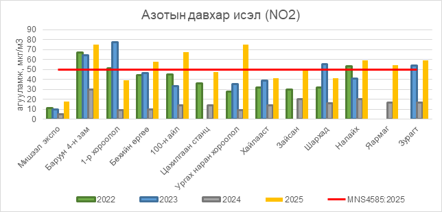Азотын давхар исэл (NO2) нь Баруун 4-н зам орчим АЧС-аас 25 мкг/м3 –ээр их, Бөхийн өргөө орчим АЧС-аас 8 мкг/м3 –ээр их, 100-н айл орчим АЧС-аас 17 мкг/м3 –ээр их, Ургах наран хороолол орчим АЧС-аас 25 мкг/м3 –ээр их, Налайх орчим АЧС-аас 9 мкг/м3 –ээр их, Яармаг орчим АЧС-аас 4 мкг/м3 –ээр их, Зурагт орчим АЧС-аас 9 мкг/м3 –ээр их, бусад цэгүүдэд MNS 4585:2025 АЧС-аас даваагүй байна.