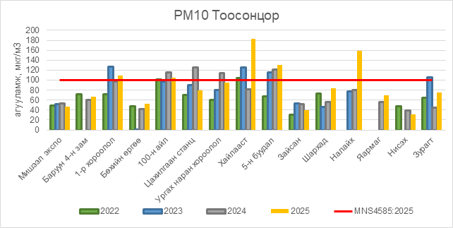 РМ10 тоосонцор нь 1-р хороолол орчим АЧС-аас 9 мкг/м3 –ээр их, 100-н айл орчим АЧС-аас 5 мкг/м3 –ээр их, Хайлааст орчим АЧС-аас 83 мкг/м3 –ээр их, 5-н буудал орчим АЧС-аас 30 мкг/м3 –ээр их, Налайх орчим АЧС-аас 59 мкг/м3 –ээр их, бусад цэгүүдэд MNS 4585:2025 АЧС-аас даваагүй байна.