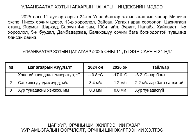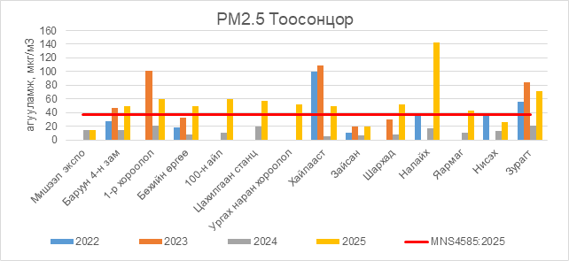 РМ2.5 тоосонцор нь Баруун 4-н зам орчим АЧС-аас 11.5 мкг/м3 –ээр их, 1-р хороолол орчим АЧС-аас 22.5 мкг/м3 –ээр их, Бөхийн өргөө орчим АЧС-аас 11.5 мкг/м3 –ээр их, 100-н айл орчим АЧС-аас 22.5 мкг/м3 –ээр их, Цахилгаан станц орчим АЧС-аас 19.5 мкг/м3 –ээр их, Ургах наран хороолол орчим АЧС-аас 14.5 мкг/м3 –ээр их, Хайлааст орчим АЧС-аас 11.5 мкг/м3 –ээр их, Шархад орчим АЧС-аас 14.5 мкг/м3 –ээр их, Налайх орчим АЧС-аас 104.5 мкг/м3 –ээр их, Яармаг орчим АЧС-аас 5.5 мкг/м3 –ээр их, Зурагт орчим АЧС-аас 33.5 мкг/м3 –ээр их, бусад цэгүүдэд MNS 4585:2025 АЧС-аас даваагүй байна.