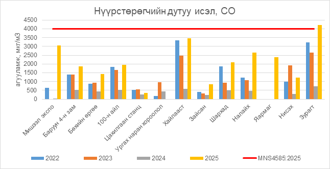 Нүүрстөрөгчийн дутуу исэл (СО) нь Зурагт орчим АЧС-аас 210 мкг/м3 –ээр их, бусад цэгүүдэд MNS 4585:2025 АЧС-аас даваагүй байна.