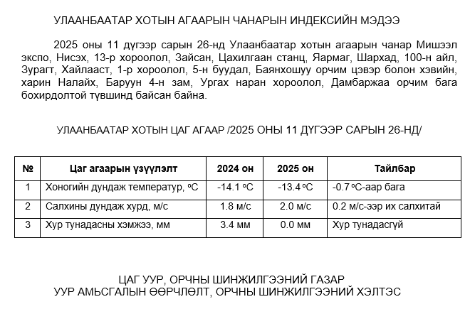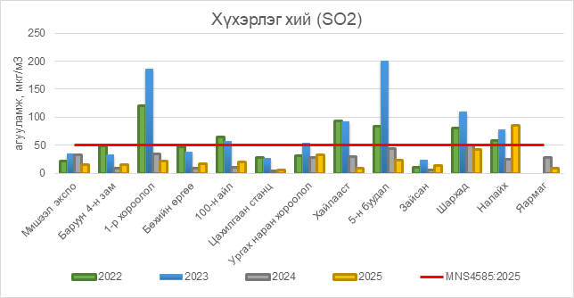 2025 оны 11 дүгээр сарын 26-ны байдлаар хүхэрлэг хий (SO2) нь Налайх орчим АЧС-аас 36 мкг/м3 –ээр их, бусад цэгүүдэд MNS 4585:2025 АЧС-аас даваагүй байна.