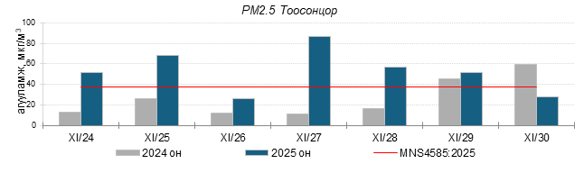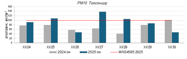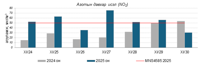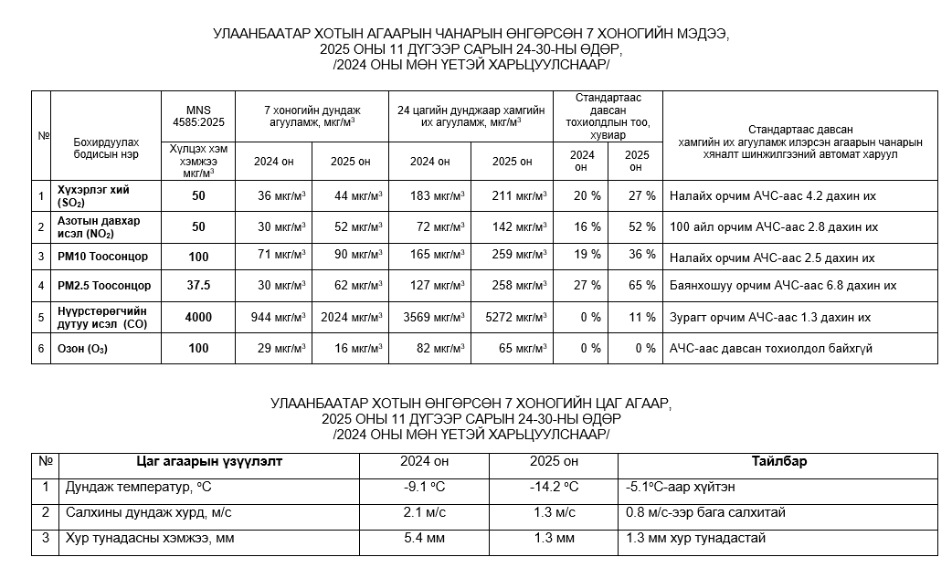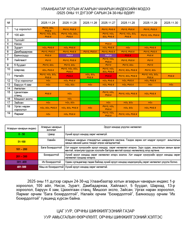 Улаанбаатар хотын агаарт түгээмэл бохирдуулах бодис хүхэрлэг хий /SO2/, азотын давхар исэл /NO2/, тоосонцор /PM10, PM2.5/, нүүрстөрөгчийн дутуу исэл /CO/, озон /O3/-ны агууламжийг тодорхойллоо.