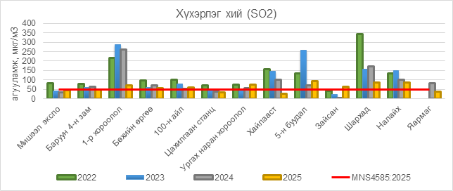 2025 оны 12 дугаар сарын 04-ний байдлаар хүхэрлэг хий (SO2) нь 1-р хороолол орчим 23 мкг/м3 –ээр их, Бөхийн өргөө орчим АЧС-аас 5 мкг/м3 –ээр их, 100-н айл орчим АЧС-аас 12 мкг/м3 –ээр их, Ургах наран хороолол орчим АЧС-аас 25 мкг/м3 –ээр их, 5-н буудал орчим АЧС-аас 43 мкг/м3 –ээр их, Зайсан орчим АЧС-аас 15 мкг/м3 –ээр их, Шархад орчим АЧС-аас 35 мкг/м3 –ээр их, Налайх орчим АЧС-аас 35 мкг/м3 –ээр их, бусад цэгүүдэд MNS 4585:2025 АЧС-аас даваагүй байна.
