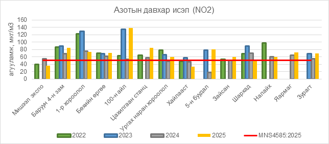 Азотын давхар исэл (NO2) нь Баруун 4-н зам орчим АЧС-аас 35 мкг/м3 –ээр их, 1-р хороолол орчим 24 мкг/м3 –ээр их, Бөхийн өргөө орчим АЧС-аас 21 мкг/м3 –ээр их, 100-н айл орчим АЧС-аас 88 мкг/м3 –ээр их, Цахилгаан станц орчим АЧС-аас 35 мкг/м3 –ээр их, Ургах наран хороолол орчим АЧС-аас 10 мкг/м3 –ээр их, 5-н буудал орчим АЧС-аас 31 мкг/м3 –ээр их, Зайсан орчим АЧС-аас 9 мкг/м3 –ээр их, Налайх орчим АЧС-аас 9 мкг/м3 –ээр их, Яармаг орчим АЧС-аас 22 мкг/м3 –ээр их, Зурагт орчим АЧС-аас 20 мкг/м3 –ээр их, бусад цэгүүдэд MNS 4585:2025 АЧС-аас даваагүй байна.