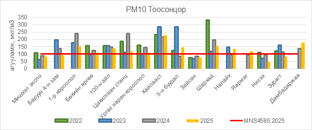 РМ10 тоосонцор нь 1-р хороолол орчим АЧС-аас 52 мкг/м3 –ээр их, Бөхийн өргөө орчим АЧС-аас 8 мкг/м3 –ээр их, 100-н айл орчим АЧС-аас 38 мкг/м3 –ээр их, Цахилгаан станц орчим АЧС-аас 119 мкг/м3 –ээр их, Ургах наран хороолол орчим АЧС-аас 9 мкг/м3 –ээр их, Хайлааст орчим АЧС-аас 127 мкг/м3 –ээр их, 5-н буудал орчим АЧС-аас 46 мкг/м3 –ээр их, Шархад орчим АЧС-аас 57 мкг/м3 –ээр их, Налайх орчим АЧС-аас 35 мкг/м3 –ээр их, Яармаг орчим АЧС-аас 19 мкг/м3 –ээр их, Дамбадаржаа орчим АЧС-аас 80 мкг/м3 –ээр их, бусад цэгүүдэд MNS 4585:2025 АЧС-аас даваагүй байна.