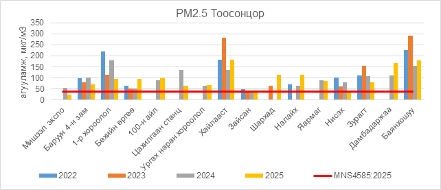 РМ2.5 тоосонцор нь Баруун 4-н зам орчим АЧС-аас 34.5 мкг/м3 –ээр их, 1-р хороолол орчим АЧС-аас 57.5 мкг/м3 –ээр их, Бөхийн өргөө орчим АЧС-аас 59.5 мкг/м3 –ээр их, 100-н айл орчим АЧС-аас 61.5 мкг/м3 –ээр их, Цахилгаан станц орчим АЧС-аас 27.5 мкг/м3 –ээр их, Ургах наран хороолол орчим АЧС-аас 29.5 мкг/м3 –ээр их, Хайлааст орчим АЧС-аас 144.5 мкг/м3 –ээр их, Зайсан орчим АЧС-аас 5.5 мкг/м3 –ээр их, Шархад орчим АЧС-аас 77.5 мкг/м3 –ээр их, Налайх орчим АЧС-аас 76.5 мкг/м3 –ээр их, Яармаг орчим АЧС-аас 48.5 мкг/м3 –ээр их, Нисэх орчим АЧС-аас 2.5 мкг/м3 –ээр их, Зурагт орчим АЧС-аас 43.5 мкг/м3 –ээр их Дамбадаржаа орчим АЧС-аас 129.5 мкг/м3 –ээр их, Баянхошуу орчим АЧС-аас 143.5 мкг/м3 –ээр их байна.