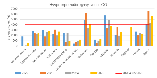 Нүүрстөрөгчийн дутуу исэл (СО) нь Хайлааст орчим АЧС-аас 175 мкг/м3 –ээр их,  Зурагт орчим АЧС-аас 1650 мкг/м3 –ээр их, бусад цэгүүдэд MNS 4585:2025 АЧС-аас даваагүй байна.