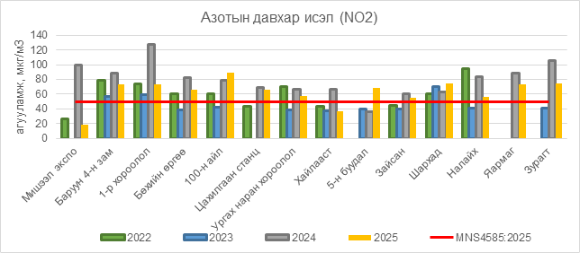 Азотын давхар исэл (NO2) нь Баруун 4-н зам орчим АЧС-аас 23 мкг/м3 –ээр их, 1-р хороолол орчим 23 мкг/м3 –ээр их, Бөхийн өргөө орчим АЧС-аас 16 мкг/м3 –ээр их, 100-н айл орчим АЧС-аас 39 мкг/м3 –ээр их, Цахилгаан станц орчим АЧС-аас 16 мкг/м3 –ээр их, Ургах наран хороолол орчим АЧС-аас 7 мкг/м3 –ээр их, 5-н буудал орчим АЧС-аас 19 мкг/м3 –ээр их, Зайсан орчим АЧС-аас 5 мкг/м3 –ээр их, Шархад орчим АЧС-аас 25 мкг/м3 –ээр их, Налайх орчим АЧС-аас 6 мкг/м3 –ээр их, Яармаг орчим АЧС-аас 23 мкг/м3 –ээр их, Зурагт орчим АЧС-аас 25 мкг/м3 –ээр их байна.