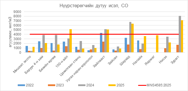 Нүүрстөрөгчийн дутуу исэл (СО) нь 100-н айл орчим АЧС-аас 1141 мкг/м3 –ээр их, Хайлааст орчим АЧС-аас 1069 мкг/м3 –ээр их, Шархад орчим АЧС-аас 2332 мкг/м3 –ээр их, Зурагт орчим АЧС-аас 3117 мкг/м3 –ээр их, бусад цэгүүдэд MNS 4585:2025 АЧС-аас даваагүй байна.