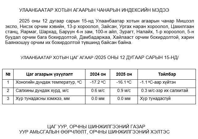 2025 оны 12 дугаар сарын 15-ны байдлаар хүхэрлэг хий (SO2) нь 1-р хороолол орчим 10 мкг/м3 –ээр их, 100-н айл орчим АЧС-аас 15 мкг/м3 –ээр их, Ургах наран хороолол орчим АЧС-аас 22 мкг/м3 –ээр их, 5-н буудал орчим АЧС-аас 6 мкг/м3 –ээр их, Шархад орчим АЧС-аас 27 мкг/м3 –ээр их, Налайх орчим АЧС-аас 20 мкг/м3 –ээр их, Яармаг орчим АЧС-аас 2 мкг/м3 –ээр их, Баянхошуу орчим АЧС-аас 114 мкг/м3 –ээр их, бусад цэгүүдэд MNS 4585:2025 АЧС-аас даваагүй байна.
