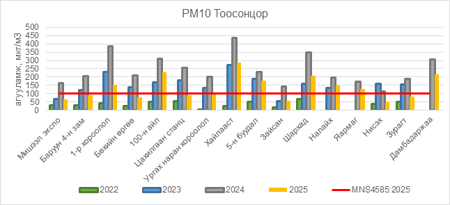 РМ10 тоосонцор нь 1-р хороолол орчим АЧС-аас 53 мкг/м3 –ээр их, 100-н айл орчим АЧС-аас 130 мкг/м3 –ээр их, Ургах наран хороолол орчим АЧС-аас 7 мкг/м3 –ээр их, Хайлааст орчим АЧС-аас 188 мкг/м3 –ээр их, 5-н буудал орчим АЧС-аас 79 мкг/м3 –ээр их, Шархад орчим АЧС-аас 108 мкг/м3 –ээр их, Налайх орчим АЧС-аас 49 мкг/м3 –ээр их, Яармаг орчим АЧС-аас 27 мкг/м3 –ээр их, Дамбадаржаа орчим АЧС-аас 115 мкг/м3 –ээр их байна.