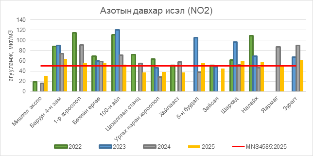 Азотын давхар исэл (NO2) нь Баруун 4-н зам орчим АЧС-аас 14 мкг/м3 –ээр их, 1-р хороолол орчим 5 мкг/м3 –ээр их, Бөхийн өргөө орчим АЧС-аас 5 мкг/м3 –ээр их, 100-н айл орчим АЧС-аас 2 мкг/м3 –ээр их, 5-н буудал орчим АЧС-аас 5 мкг/м3 –ээр их, Шархад орчим АЧС-аас 10 мкг/м3 –ээр их, Налайх орчим АЧС-аас 7 мкг/м3 –ээр их, Зурагт орчим АЧС-аас 11 мкг/м3 –ээр их, бусад цэгүүдэд MNS 4585:2025 АЧС-аас даваагүй байна.