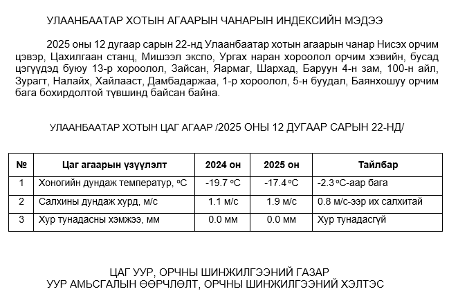 2025 оны 12 дугаар сарын 22-ны байдлаар хүхэрлэг хий (SO2) нь Зайсан орчим АЧС-аас 9 мкг/м3 –ээр их, Шархад орчим АЧС-аас 4 мкг/м3 –ээр их, Баянхошуу орчим АЧС-аас 57 мкг/м3 –ээр их, бусад цэгүүдэд MNS 4585:2025 АЧС-аас даваагүй байна.