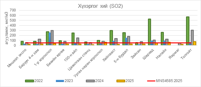 2025 оны 12 дугаар сарын 30-ны байдлаар хүхэрлэг хий (SO2) нь Ургах наран хороолол орчим АЧС-аас 12 мкг/м3 –ээр их, Налайх орчим АЧС-аас 11 мкг/м3 –ээр их, Толгойт орчим АЧС-аас 29 мкг/м3 –ээр их, бусад цэгүүдэд MNS 4585:2025 АЧС-аас даваагүй байна.