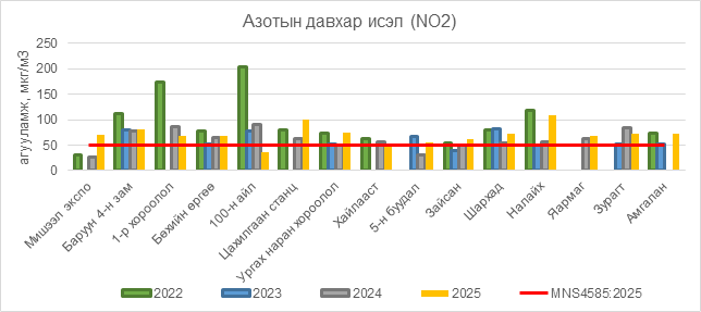 Азотын давхар исэл (NO2) нь Мишээл экспо орчим АЧС-аас 20 мкг/м3 –ээр их, Баруун 4-н зам орчим АЧС-аас 31 мкг/м3 –ээр их, 1-р хороолол орчим 19 мкг/м3 –ээр их, Бөхийн өргөө орчим АЧС-аас 18 мкг/м3 –ээр их, Цахилгаан станц орчим АЧС-аас 51 мкг/м3 –ээр их, Ургах наран хороолол орчим АЧС-аас 24 мкг/м3 –ээр их, 5-н буудал орчим АЧС-аас 6 мкг/м3 –ээр их, Зайсан орчим АЧС-аас 12 мкг/м3 –ээр их, Шархад орчим АЧС-аас 22 мкг/м3 –ээр их, Налайх орчим АЧС-аас 58 мкг/м3 –ээр их, Яармаг орчим АЧС-аас 18 мкг/м3 –ээр их, Зурагт орчим АЧС-аас 23 мкг/м3 –ээр их, Амгалан  орчим АЧС-аас 22 мкг/м3 –ээр их байна.