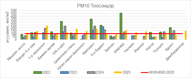 РМ10 тоосонцор нь Мишээл экспо орчим АЧС-аас 11 мкг/м3 –ээр их, Баруун 4-н зам орчим АЧС-аас 44 мкг/м3 –ээр их, 1-р хороолол орчим АЧС-аас 136 мкг/м3 –ээр их, 100-н айл орчим АЧС-аас 22 мкг/м3 –ээр их, Цахилгаан станц орчим АЧС-аас 82 мкг/м3 –ээр их, Ургах наран хороолол орчим АЧС-аас 46 мкг/м3 –ээр их, Хайлааст орчим АЧС-аас 85 мкг/м3 –ээр их, 5-н буудал орчим АЧС-аас 5 мкг/м3 –ээр их, Шархад орчим АЧС-аас 66 мкг/м3 –ээр их, Налайх орчим АЧС-аас 22 мкг/м3 –ээр их, Яармаг орчим АЧС-аас 40 мкг/м3 –ээр их, Дамбадаржаа орчим АЧС-аас 49 мкг/м3 –ээр их байна.