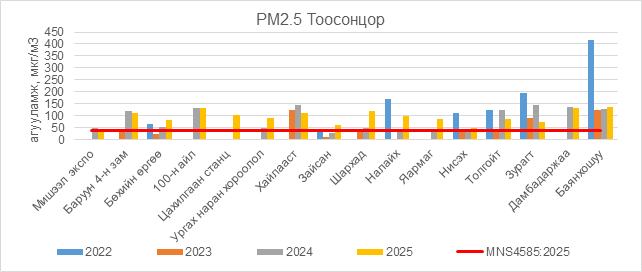 РМ2.5 тоосонцор нь Мишээл экспо орчим АЧС-аас 6.5 мкг/м3 –ээр их, Баруун 4-н зам орчим АЧС-аас 71.5 мкг/м3 –ээр их, Бөхийн өргөө орчим АЧС-аас 44.5 мкг/м3 –ээр их, 100-н айл орчим АЧС-аас 93.5 мкг/м3 –ээр их, Цахилгаан станц орчим АЧС-аас 63.5 мкг/м3 –ээр их, Ургах наран хороолол орчим АЧС-аас 54.5 мкг/м3 –ээр их, Хайлааст орчим АЧС-аас 72.5 мкг/м3 –ээр их, Зайсан орчим АЧС-аас 21.5 мкг/м3 –ээр их, Шархад орчим АЧС-аас 83.5 мкг/м3 –ээр их, Налайх орчим АЧС-аас 61.5 мкг/м3 –ээр их, Яармаг орчим АЧС-аас 47.5 мкг/м3 –ээр их, Нисэх орчим АЧС-аас 12.5 мкг/м3 –ээр их, Толгойт орчим АЧС-аас 46.5 мкг/м3 –ээр их, Зурагт орчим АЧС-аас 35.5 мкг/м3 –ээр их, Дамбадаржаа орчим АЧС-аас 95.5 мкг/м3 –ээр их, Баянхошуу орчим АЧС-аас 100.5 мкг/м3 –ээр их байна.