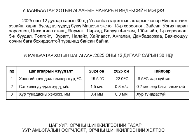 УЛААНБААТАР ХОТЫН АГААРЫН ЧАНАРЫН ХЯНАЛТ ШИНЖИЛГЭЭНИЙ ХОНОГИЙН МЭДЭЭ /2025.12.30/