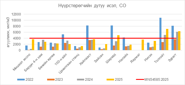 Нүүрстөрөгчийн дутуу исэл (СО) нь Шархад орчим АЧС-аас 1022 мкг/м3 –ээр их, Толгойт орчим АЧС-аас 3120 мкг/м3 –ээр их, Зурагт орчим АЧС-аас 2382 мкг/м3 –ээр их, бусад цэгүүдэд MNS 4585:2025 АЧС-аас даваагүй байна.
