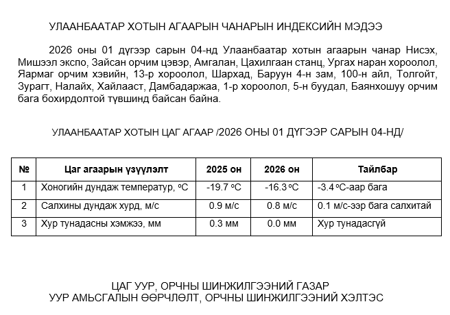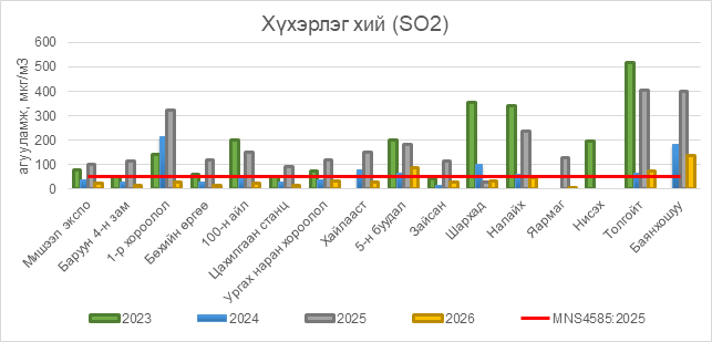 2026 оны 01 дүгээр сарын 04-ний байдлаар хүхэрлэг хий (SO2) нь 5-н буудал орчим АЧС-аас 36 мкг/м3 –ээр их, Толгойт орчим АЧС-аас 22 мкг/м3 –ээр их, Баянхошуу орчим АЧС-аас 86 мкг/м3 –ээр их, бусад цэгүүдэд MNS 4585:2025 АЧС-аас даваагүй байна.
