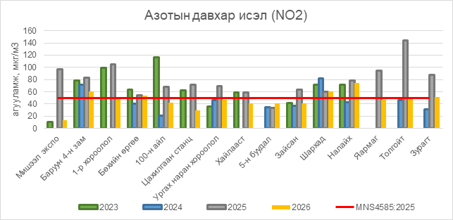 Азотын давхар исэл (NO2) нь Баруун 4-н зам орчим АЧС-аас 11 мкг/м3 –ээр их, 1-р хороолол орчим 1 мкг/м3 –ээр их, Бөхийн өргөө орчим АЧС-аас 4 мкг/м3 –ээр их, Шархад орчим АЧС-аас 11 мкг/м3 –ээр их, Налайх орчим АЧС-аас 25 мкг/м3 –ээр их, Толгойт орчим АЧС-аас 2 мкг/м3 –ээр их, Зурагт орчим АЧС-аас 2 мкг/м3 –ээр их, бусад цэгүүдэд MNS 4585:2025 АЧС-аас даваагүй байна.