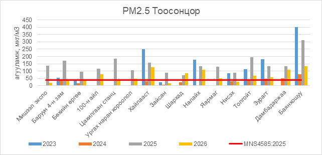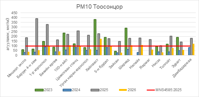РМ10 тоосонцор нь 100-н айл орчим АЧС-аас 6 мкг/м3 –ээр их, Хайлааст орчим АЧС-аас 75 мкг/м3 –ээр их, 5-н буудал орчим АЧС-аас 3 мкг/м3 –ээр их, Шархад орчим АЧС-аас 7 мкг/м3 –ээр их, Налайх орчим АЧС-аас 9 мкг/м3 –ээр их, Дамбадаржаа орчим АЧС-аас 22 мкг/м3 –ээр их, бусад цэгүүдэд MNS 4585:2025 АЧС-аас даваагүй байна.