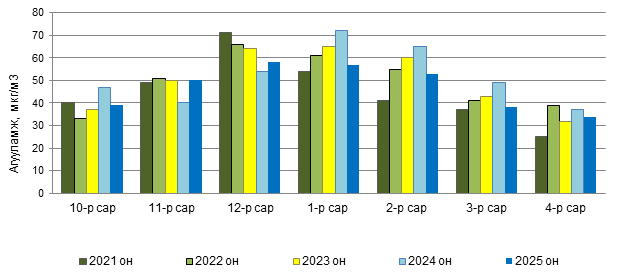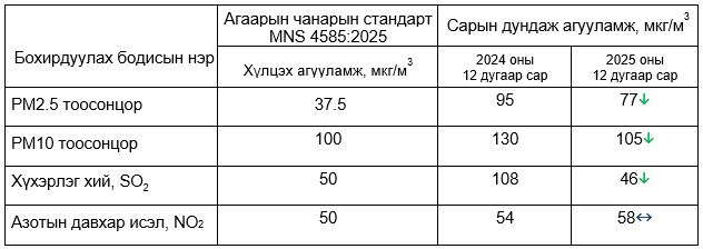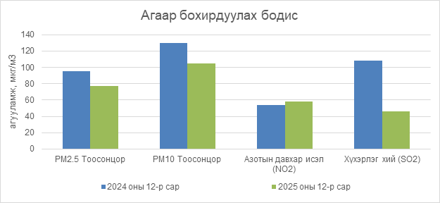 Улаанбаатар хотын агаар бохирдуулах бодисын 2025 оны 12 дугаар сарын дундаж агууламжийг өмнөх оны мөн үе буюу 2024 оны 12 дугаар сарын дундаж агууламжтай харьцуулахад PM2.5 тоосонцор 18 мкг/м3-ээр буюу 19 %-иар, PM10 тоосонцор 25 мкг/м3-ээр буюу 19 %-иар, хүхэрлэг хий (SO2) нь 62 мкг/м3-ээр буюу 57 %-иар тус тус бага, харин азотын давхар исэл (NO2) нь 4 мкг/м3-ээр буюу 7 %-иар их байлаа.