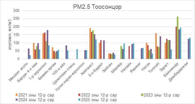 Зураг 2. PM2.5 тоосонцрын 12 дугаар сарын агууламж, 2021-2025 он